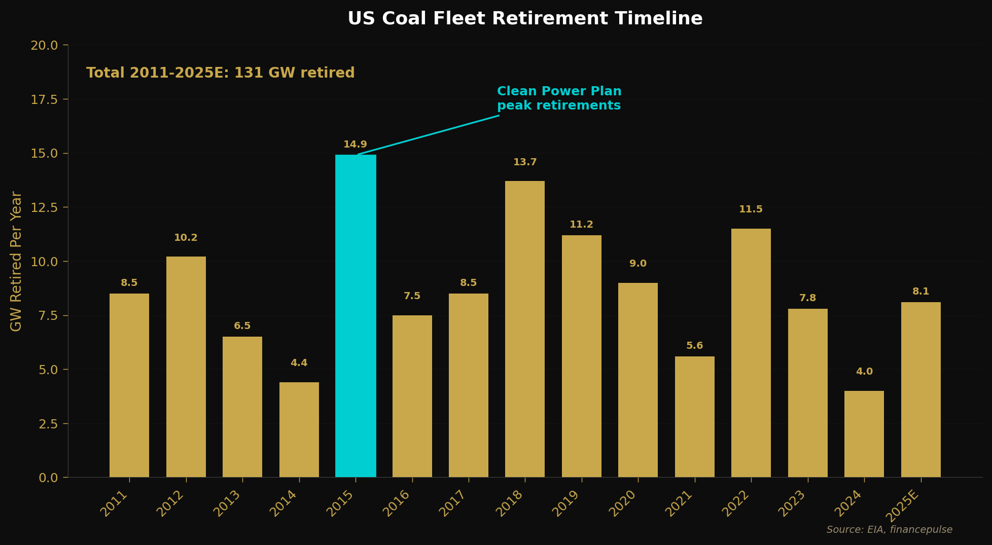 The industry spent the next decade and a half picking itself up. Orders recovered modestly, driven mainly by coal-to-gas switching as cheap shale gas made coal plants uneconomic. Between 2011 and 2025, the US retired over 131 GW of coal capacity - every gigawatt creating some replacement demand for gas.