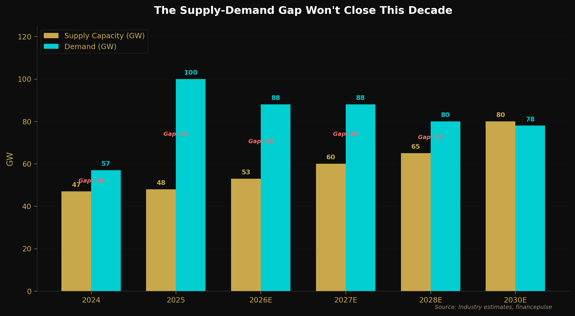 47 vs. 100 - Industry supply capacity in GW versus demand in GW. A 53 GW gap. Even with aggressive expansion, supply doesn’t catch demand until end of decade at the earliest.