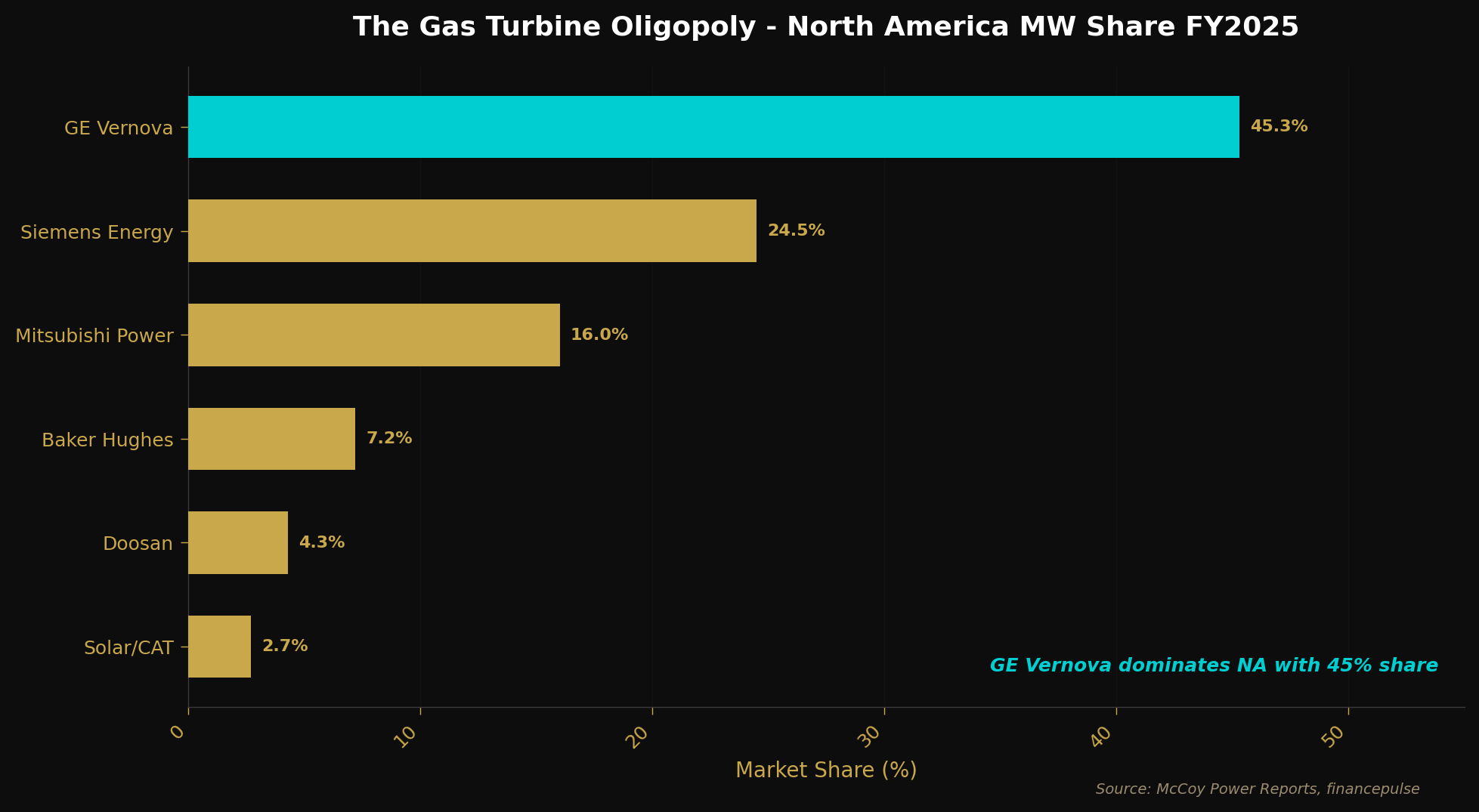 The result is one of the most concentrated industrial markets. GE Vernova, Siemens Energy, and Mitsubishi Power split 87% of global gas turbine orders by megawatt. The remaining 13% is fought over by Baker Hughes, Doosan, Caterpillar, and a growing roster of creative newcomers converting airplane engines into power plants.